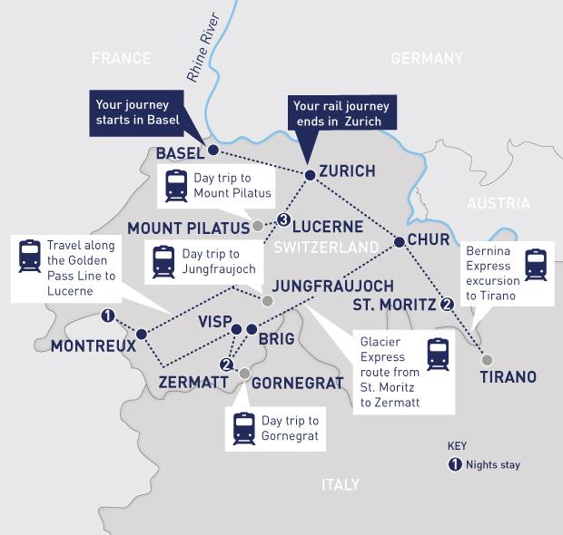 Once you have enjoyed your breakfast and checked out of your hotel, take the short rail trip to Zurich to continue with your onward travels. If you wish to extend your journey, or take this journey in reverse, one of our Rail Specialists would be happy help you with all the details.B