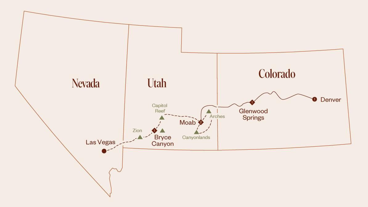 Depart Moab in the afternoon and travel onboard Canyon Spirit, where you'll enjoy a delicious locally inspired dinner. You'll cross the Utah-Colorado border with stunning mountain views in the background before arriving in the resort town of Glenwood Springs. End your day with an overnight stay in Glenwood Springs.