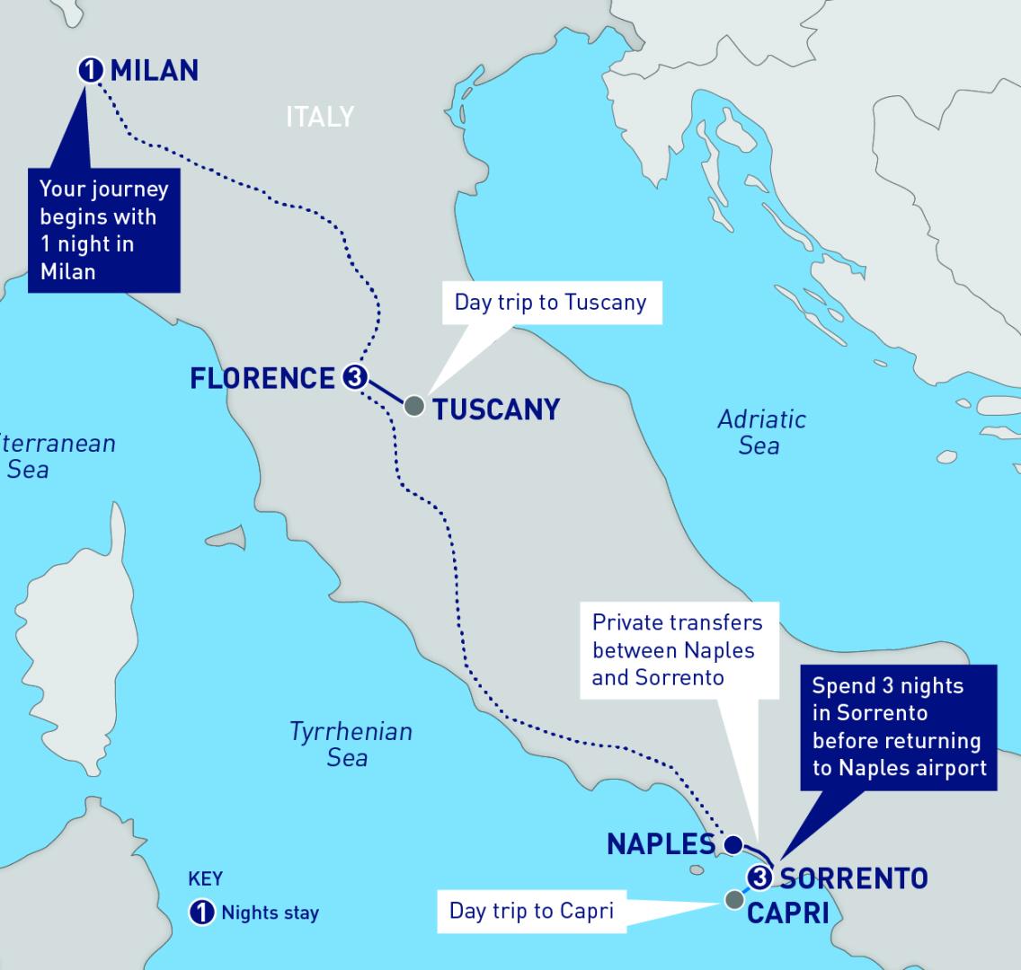 This 8-day train journey through Italy is a remarkable blend of art, culture, cuisine, and natural beauty. Starting in the cosmopolitan city of Milan, you'll experience Italy's vibrant fashion and architecture. Then, Florence, the cradle of the Renaissance, will captivate you with its world-class art and history. A guided tour will take you through the splendid landscapes of Tuscany, including Pisa, Siena, San Gimignano, and the Chianti wine region. You’ll learn to master iconic Italian recipes at a cooking class in the heart of the city. The journey continues to the coastal gem of Sorrento, where you'll explore the Sorrento Coast, the captivating island of Capri, and the breathtaking Amalfi Coast villages of Positano, Ravello, and Amalfi. This itinerary showcases the best of Italy, paired with the convenience of high-speed train travel.