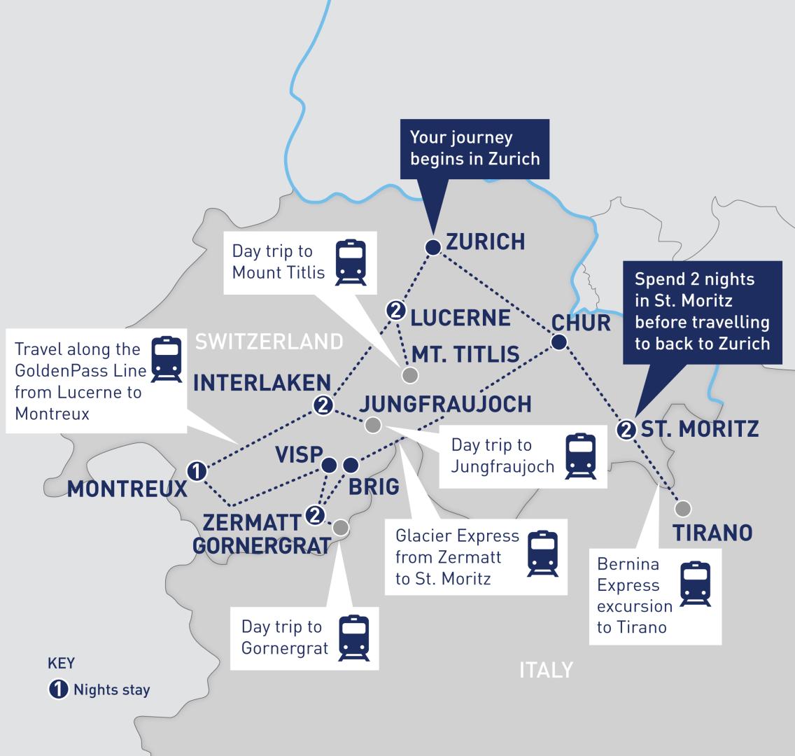 Check out of your hotel and transfer to Zurich airport for your flight home. If you wish to extend your holiday, please contact one of our AAA Rail Experts who will be able to help. B